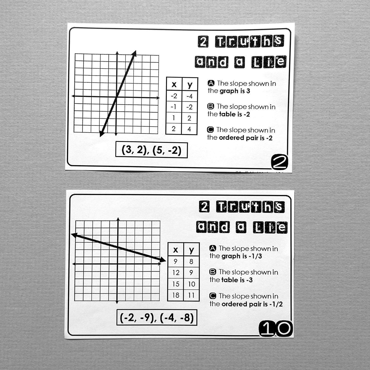 On each card there is a graph, a table and a pair of coordinates, as well as 3 statements about each representation's slope. Students need to figure out which of the 3 statements is false (the "lie"), then correct the false statement on their answer sheet.