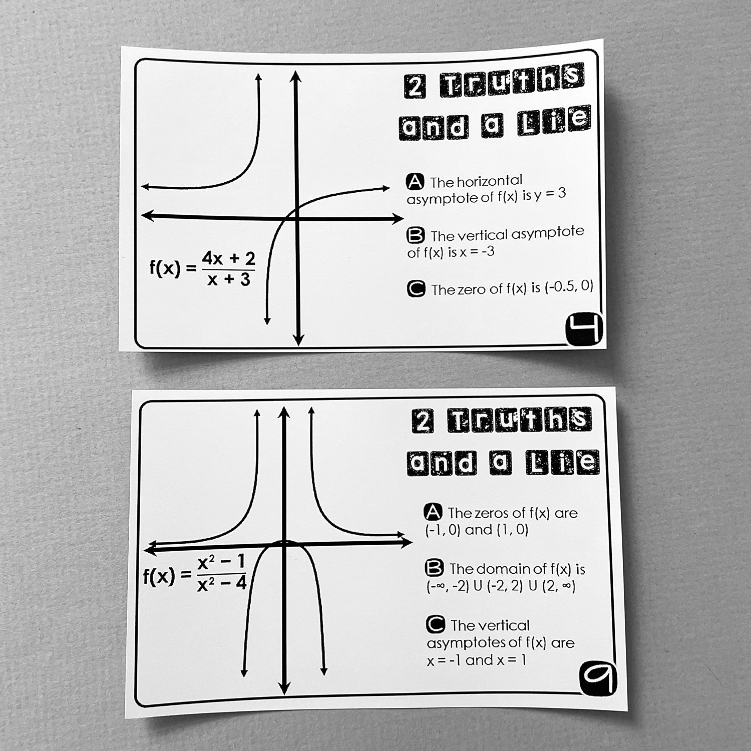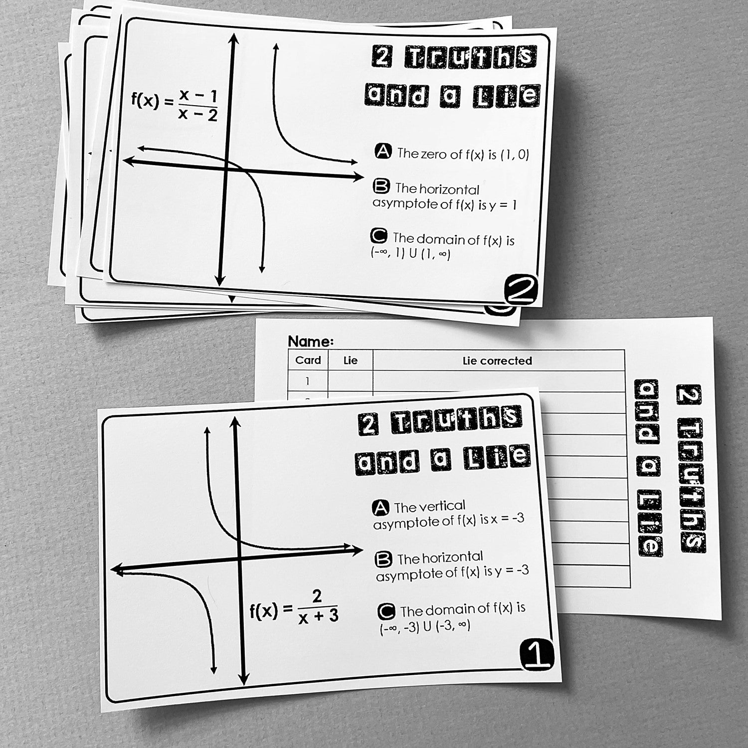 On each card there is a rational equation and three statements about its vertical asymptote, horizontal asymptote, zeros, domain and/or range. Students need to figure out which of the 3 statements is false (the "lie"), then correct the false statement on their answer sheet.