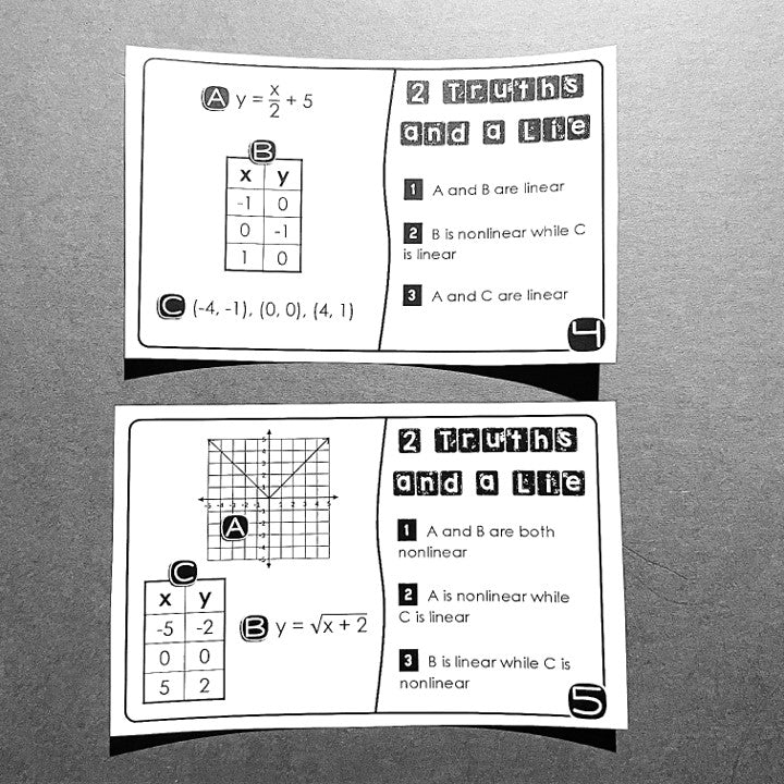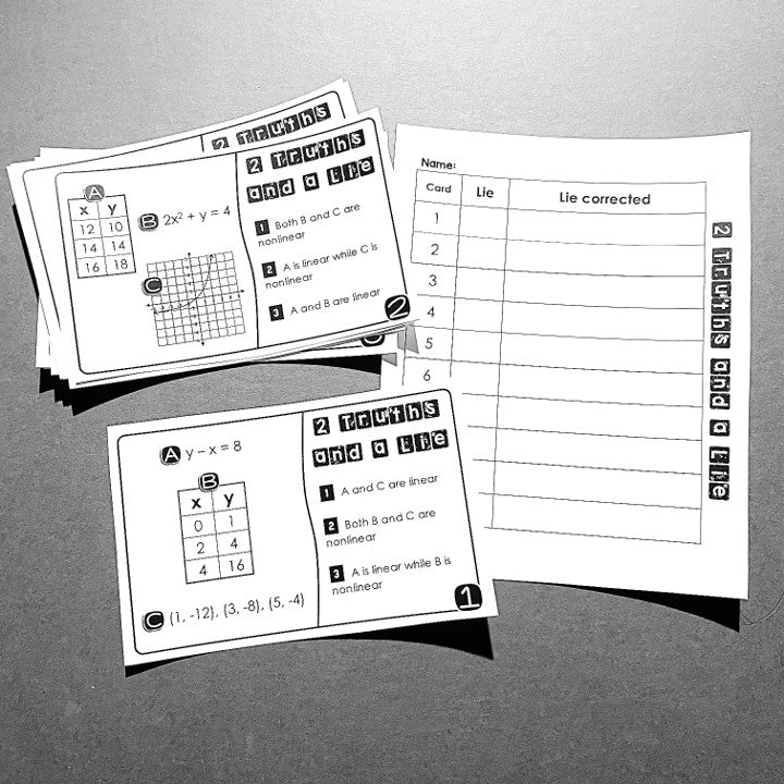 On each card there are 3 function representations and 3 statements about whether the functions are linear or nonlinear. Students need to figure out which of the 3 statements is false (the "lie"), then correct the false statement on their answer sheet.