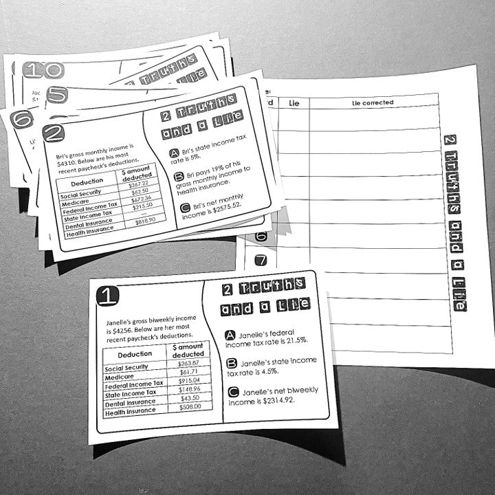 "2 Truths and a Lie" Paycheck Deductions Net & Gross Pay Error Analysis Activity