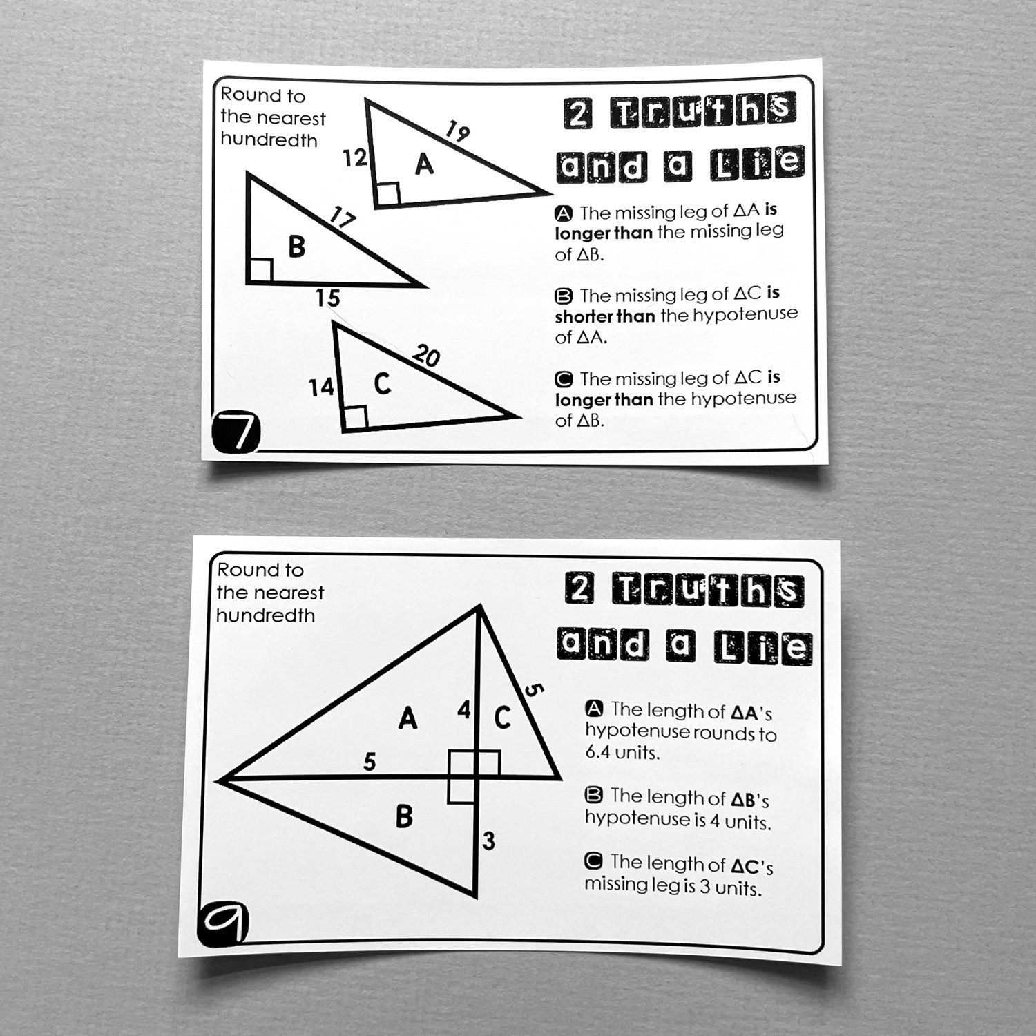 On each card there are 3 right triangles, as well as 3 statements about each triangle's hypotenuse or missing leg. Students need to figure out which of the 3 statements is false (the "lie"), then correct the false statements on their answer sheet.