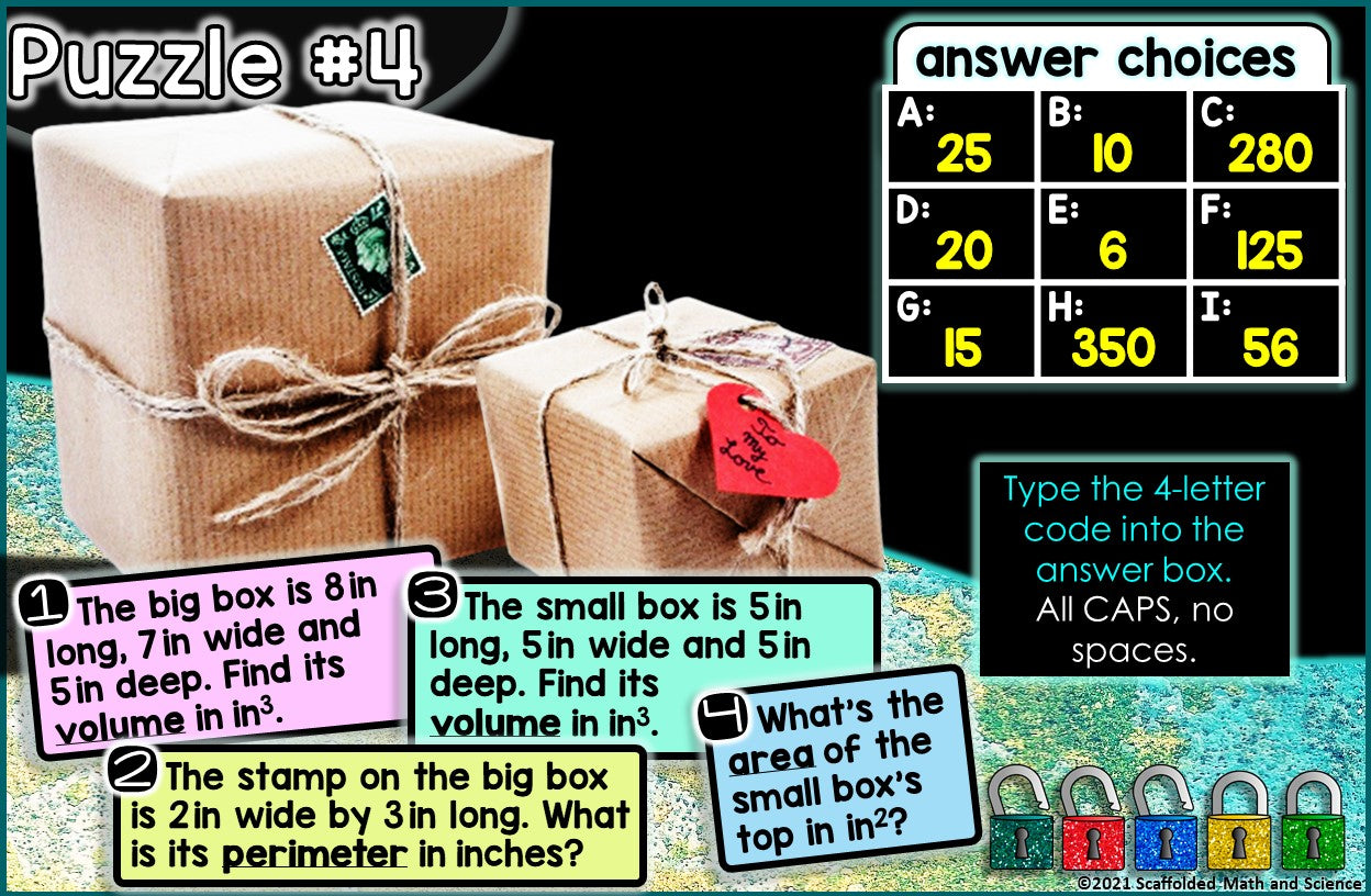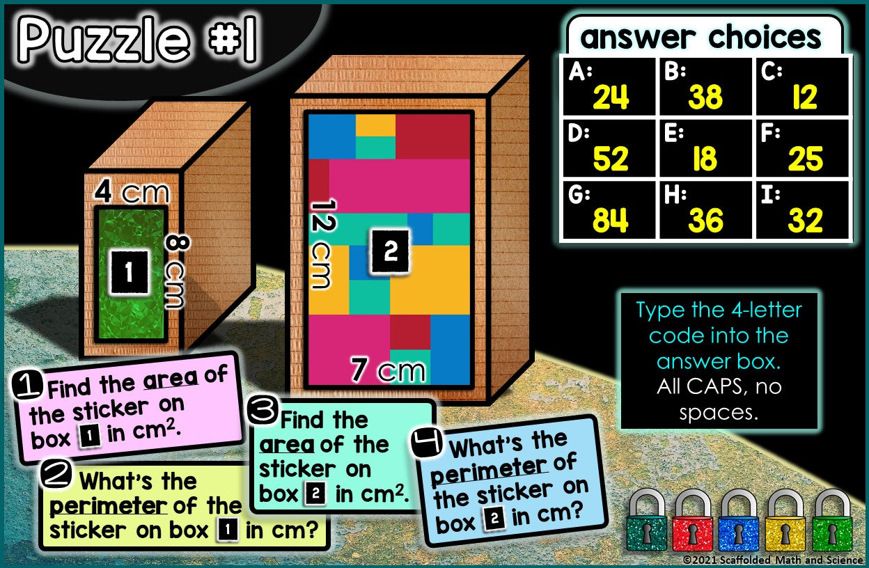 Students must unlock 5 locks through answering 20 area, perimeter and volume questions. Questions are grouped 4 per puzzle, resulting in five 4-letter codes that will unlock all 5 locks.