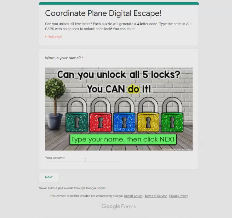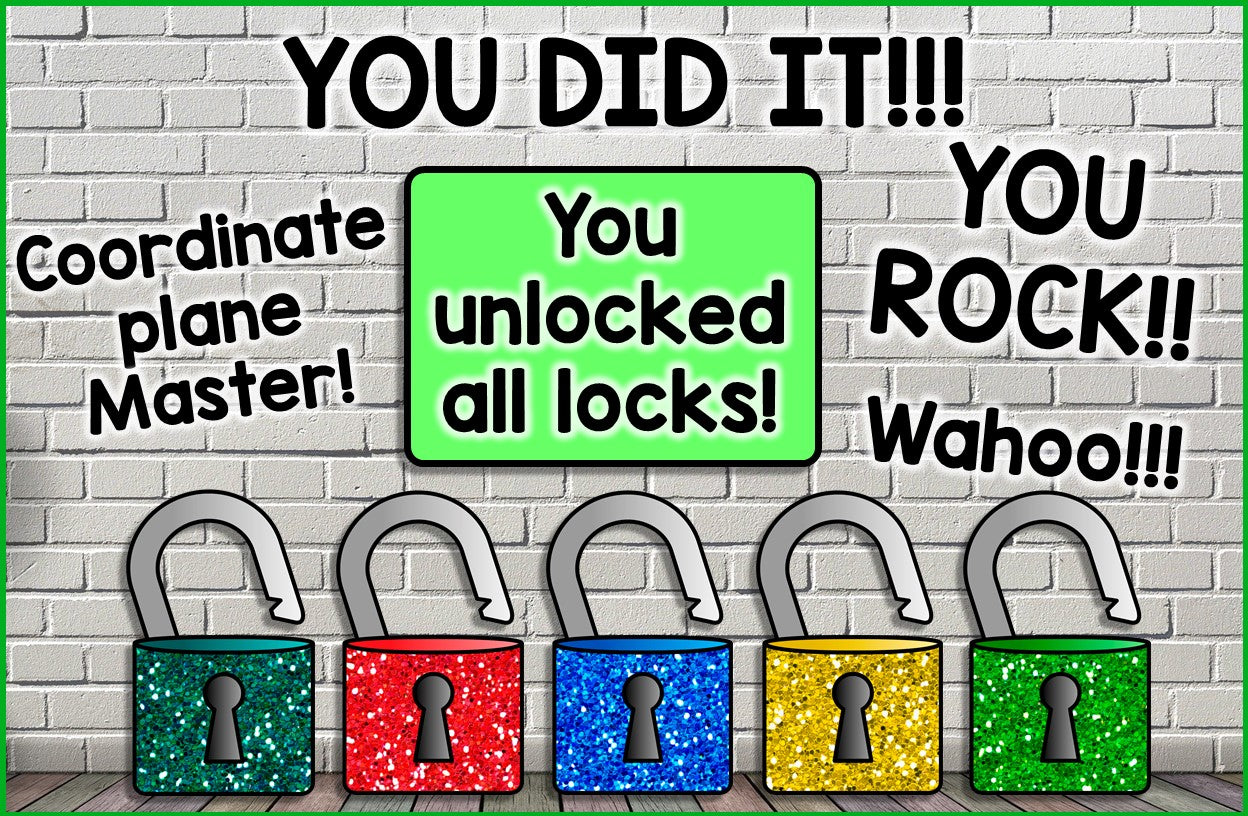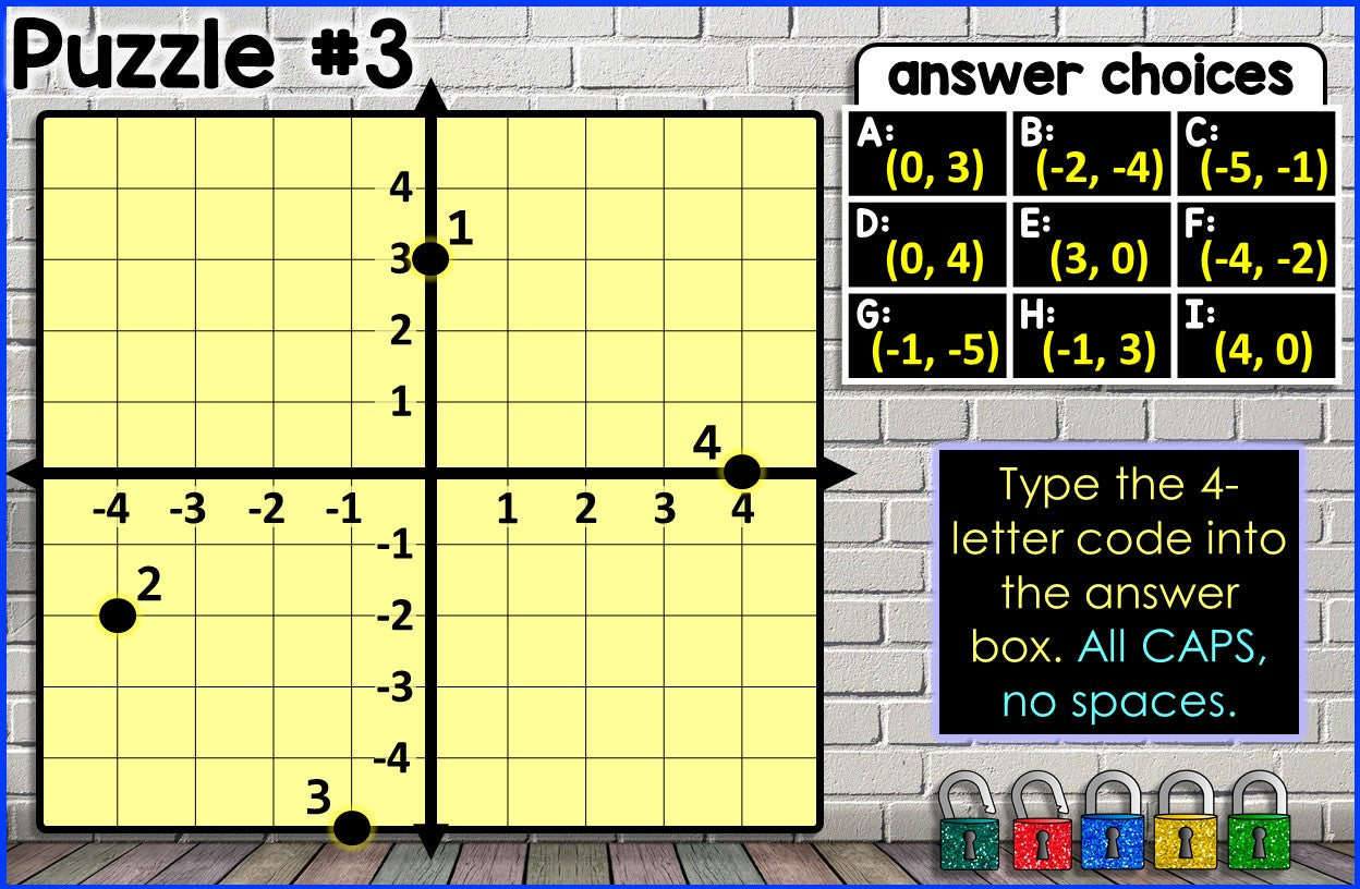 Questions are grouped 4 per puzzle, resulting in five 4-letter codes that will unlock all 5 locks. To unlock each lock, students are shown 4 coordinate points to identify.