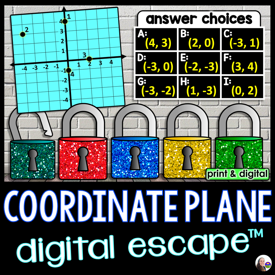 An engaging math escape room to review plotting coordinate pairs in the 4 quadrants. Students must unlock 5 locks through identifying 20 points on the the coordinate plane.
