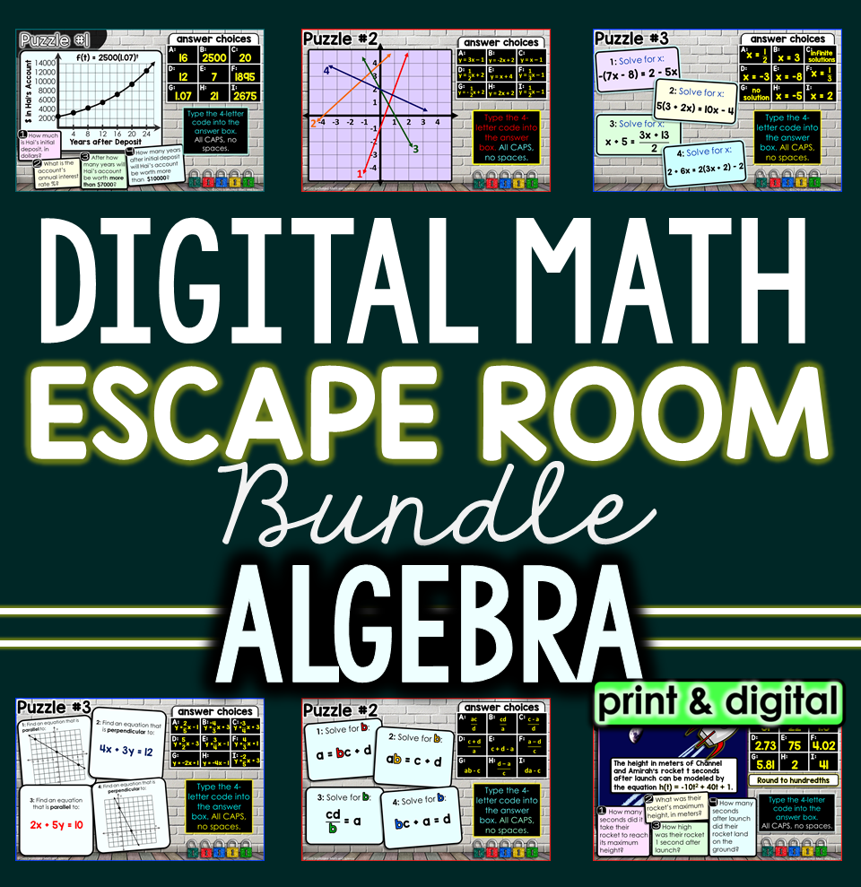 This bundle of digital math escape rooms will engage your algebra students while being a breeze to assign. Each now comes as a self-checking digital escape room and as a printable black & white PDF.