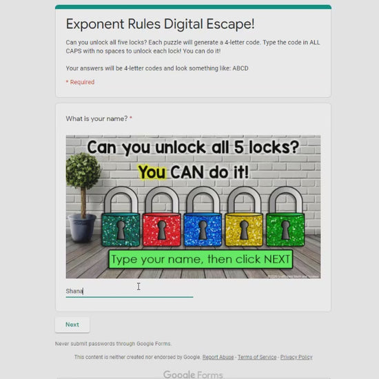 An engaging math escape room to review simplifying expressions using the laws of exponents. Students must unlock 5 locks through simplifying 20 expressions with the product rule, the quotient rule, the power rule, the power of a fraction rule, the zero exponent rule and the negative exponent rule. Questions are grouped 4 per puzzle, resulting in five 4-letter codes that will unlock all 5 locks.