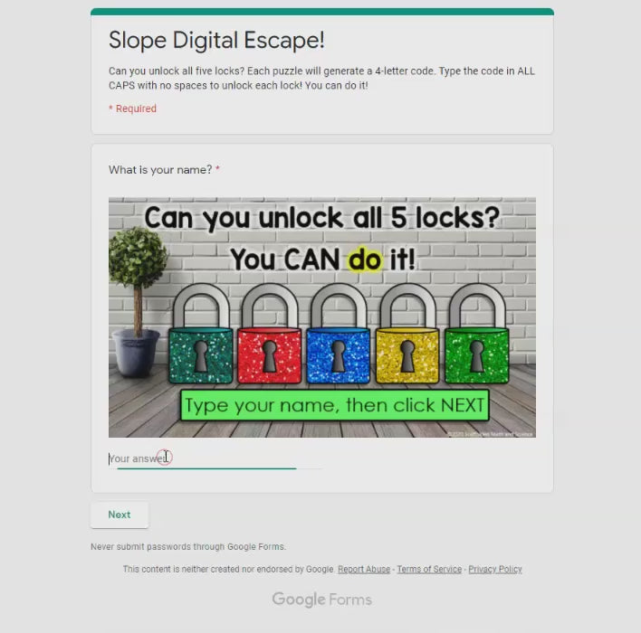 The entire activity is housed in one GOOGLE Form. There are no links to outside websites. The 4-letter codes are set with answer validation so that students cannot move to the next puzzle until they enter the correct code. Includes answer key.