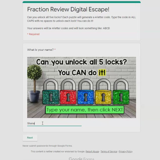 An engaging math escape room to review simplifying, converting, adding, subtracting, multiplying and dividing fractions. Questions are grouped 4 per puzzle, resulting in five 4-letter codes that will unlock all 5 locks.