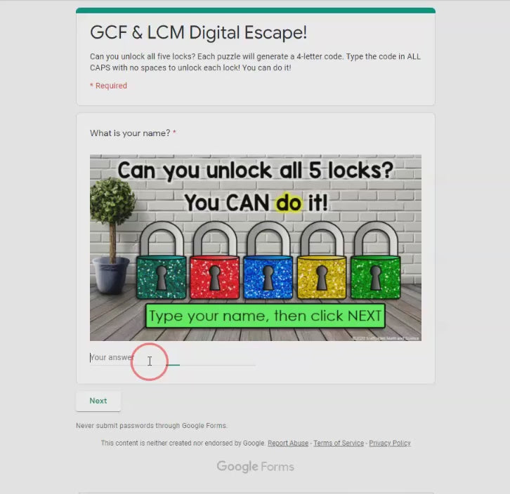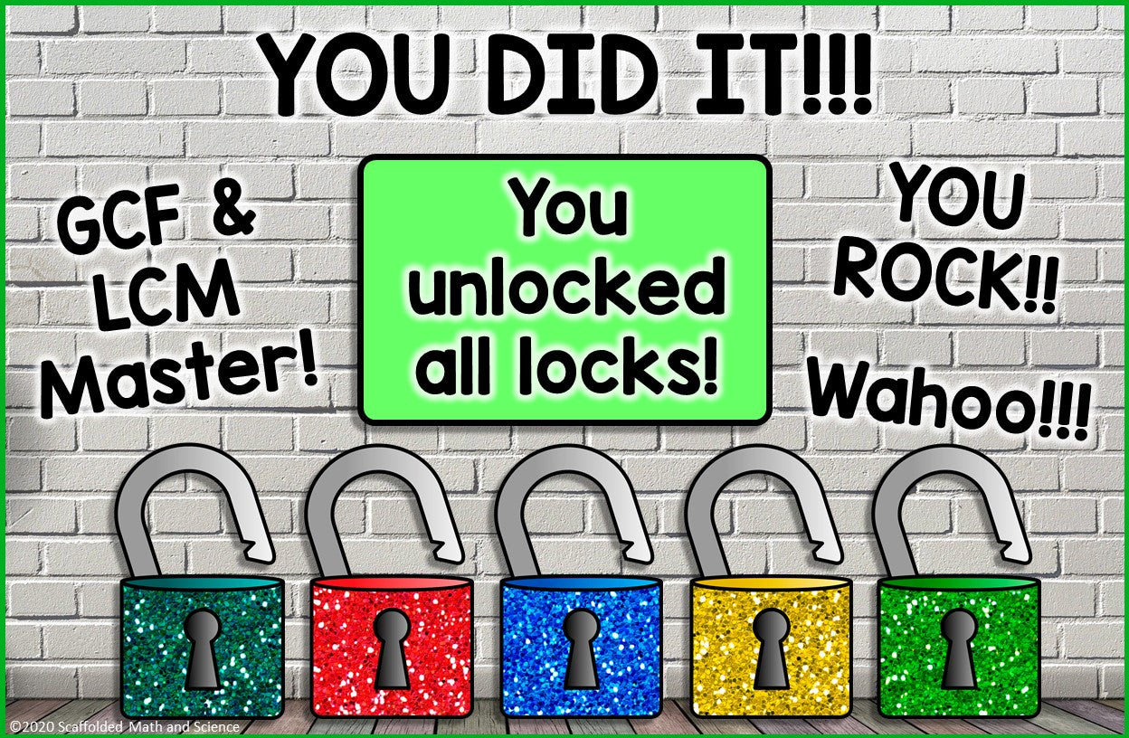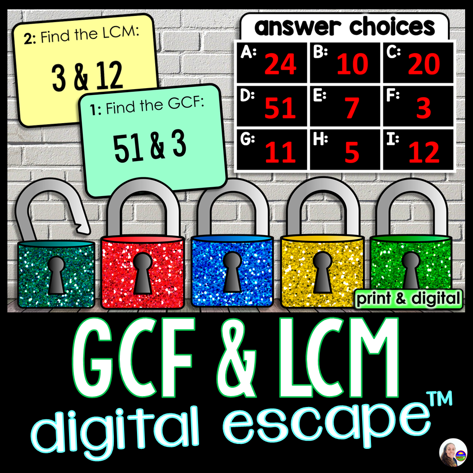 An engaging math escape room for students learning to find GCF and LCM. Students must unlock 5 locks through finding either the Greatest Common Factor or the Least Common Multiple of 20 number pairs. Questions are grouped 4 per puzzle, resulting in five 4-letter codes that will unlock all 5 locks.