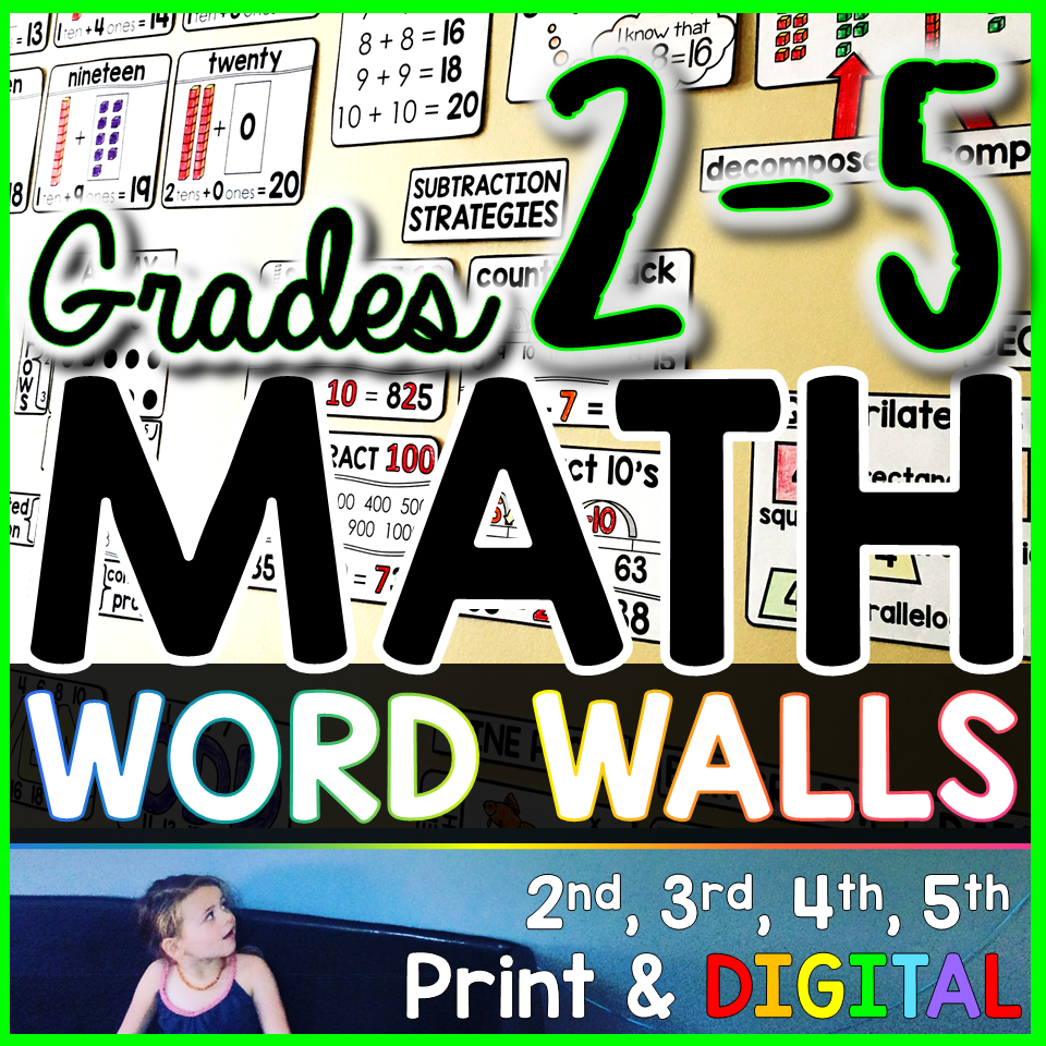 Each word wall shows math vocabulary and concepts in context through bright visuals and examples. All of the topics covered are listed in each word wall listing above.