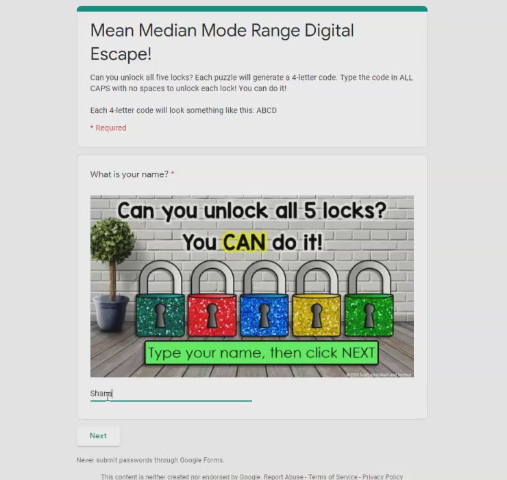An engaging math escape room for reviewing measures of central tendency. Students must unlock 5 locks by finding mean, median, mode and range in 5 sets of data. Questions are grouped 4 per puzzle, resulting in five 4-letter codes that will unlock all 5 locks.