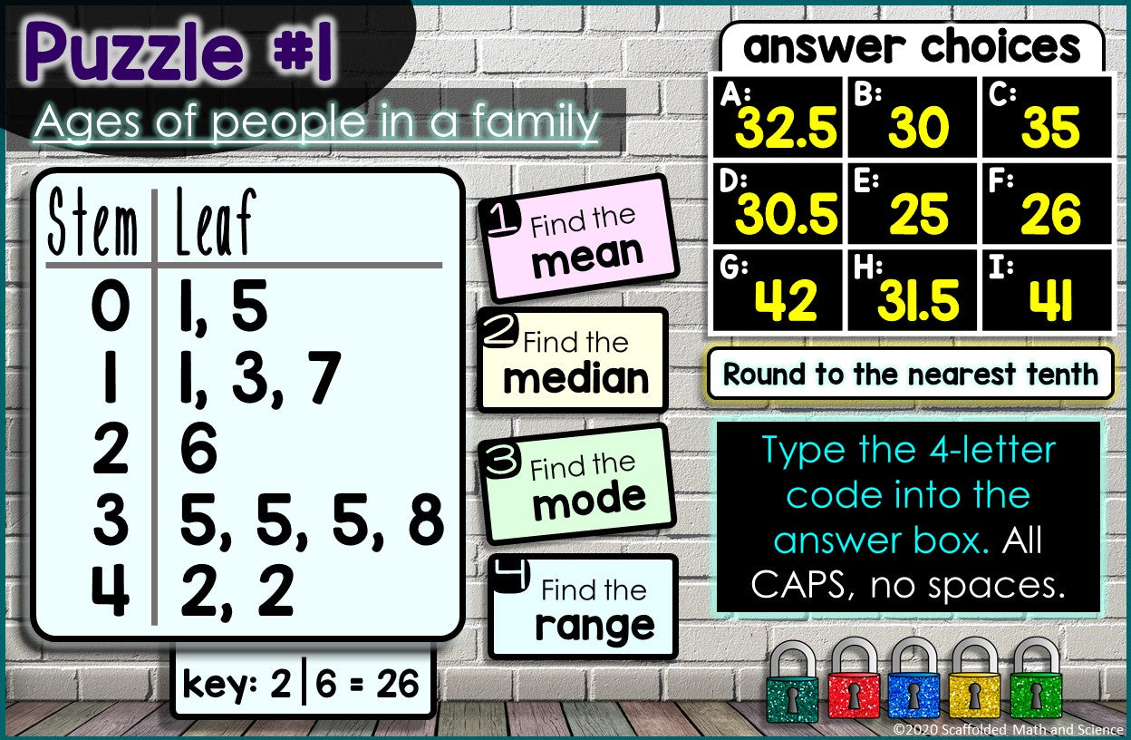 I love that this activity didn't just review mean, median, mode, and range but that it put in different data sources to figure it out from. My students found this one a little more challenging than most escape rooms and I like that they had to re-examine some of their answers. — Angela J.
