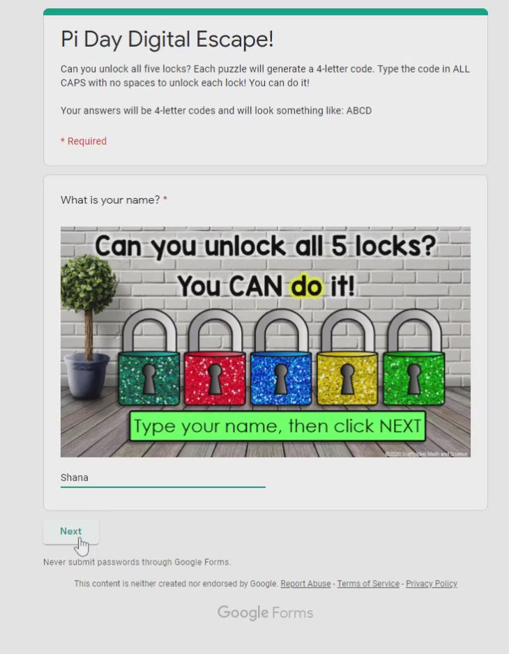 The entire activity is housed in one GOOGLE Form. There are no links to outside websites. The 4-letter codes are set with answer validation so that students cannot move to the next puzzle until they enter the correct code. Includes answer key.