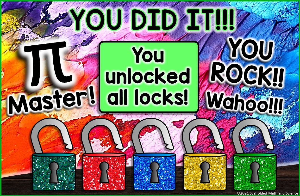 An engaging math escape room for celebrating Pi Day in your middle school math classroom! In this activity, students work with the circle formulas to unlock 5 locks. Questions are grouped 4 per puzzle, resulting in five 4-letter codes that will unlock all 5 locks. Each puzzle also includes a fun fact about pi.