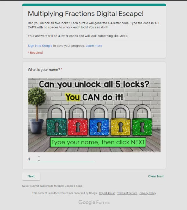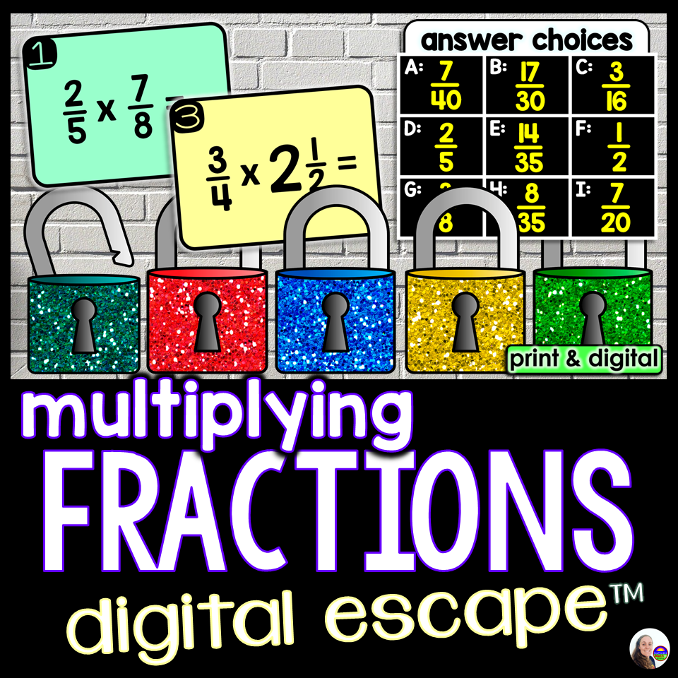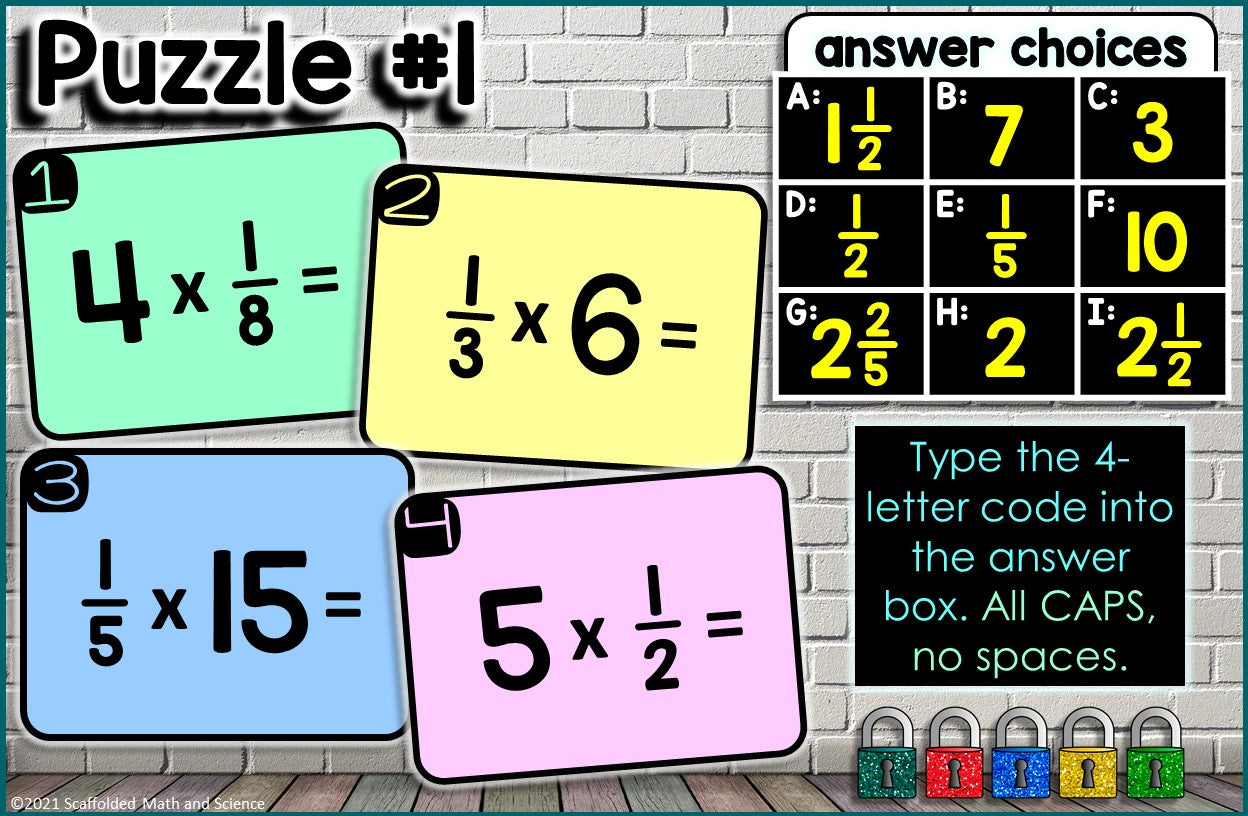 An engaging math escape room to review fraction multiplication. Students must unlock 5 locks by finding the products in 20 fraction multiplication problems. Questions are grouped 4 per puzzle, resulting in five 4-letter codes that will unlock all 5 locks.