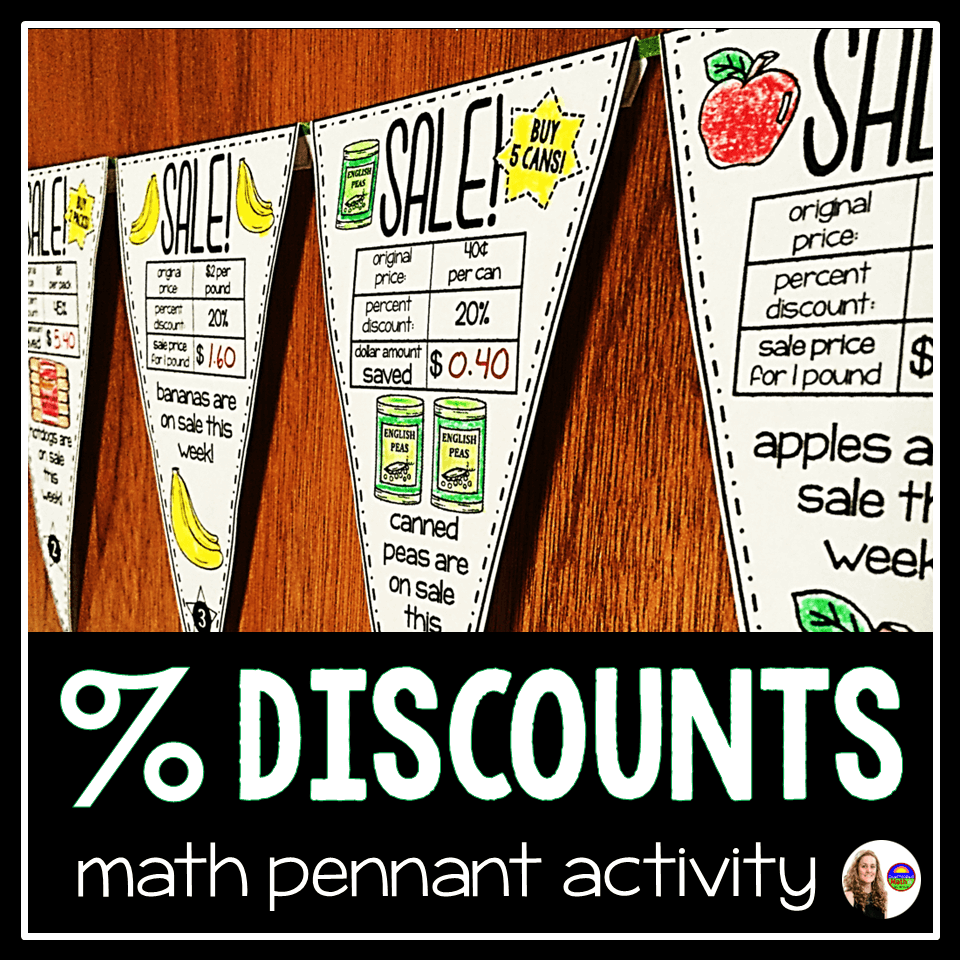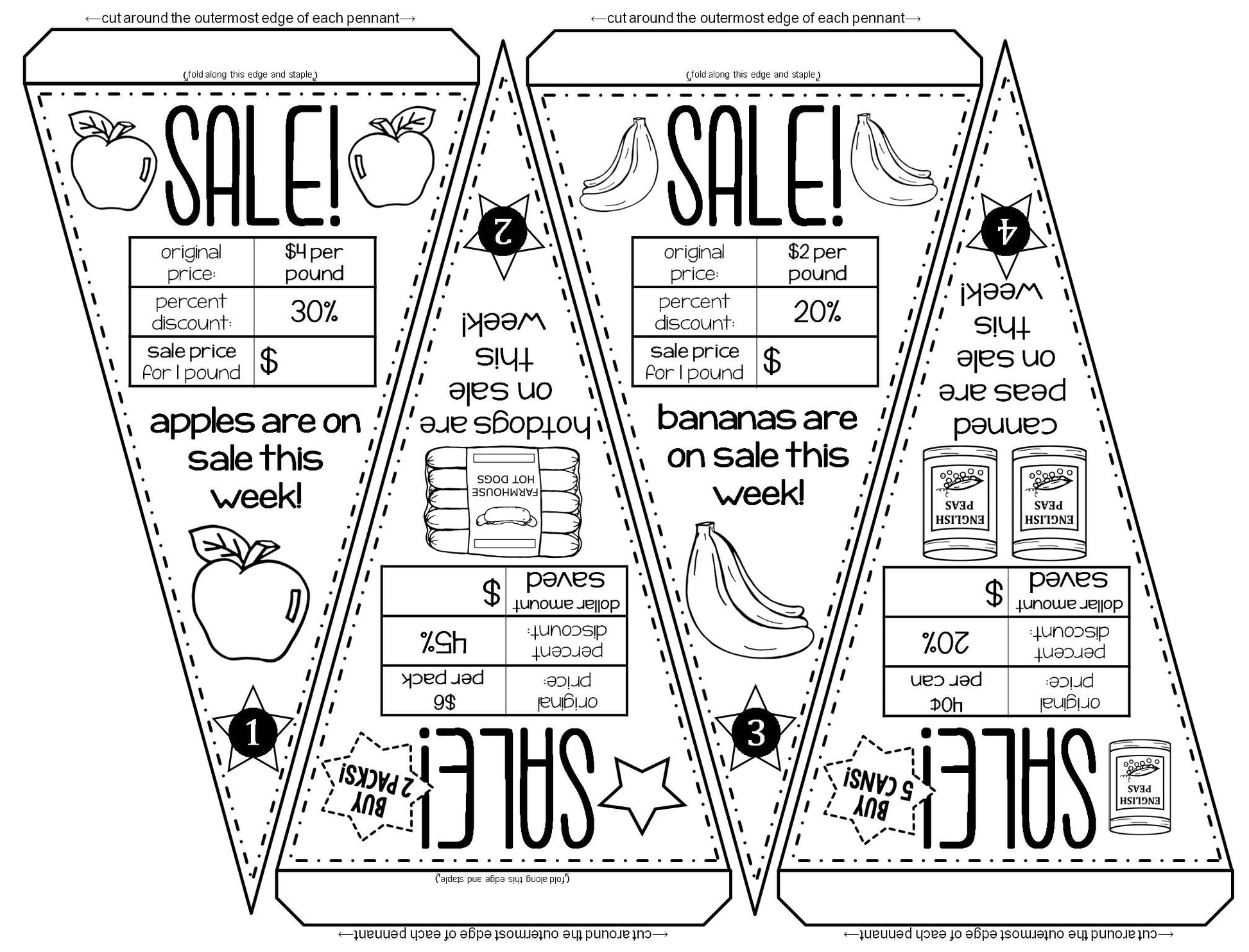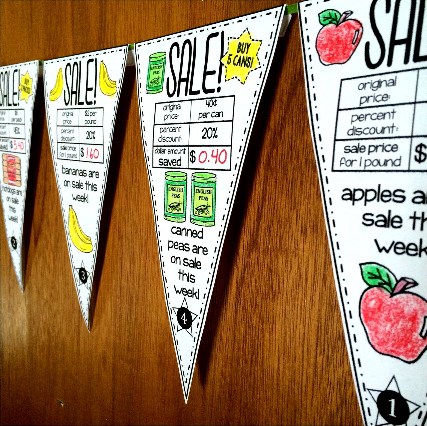 Students calculate sale prices and discount amounts on grocery store items in this shopping activity that doubles as math classroom décor. Once a pennant is complete, it can be hung along a string in your classroom to show the world that, "Hey, we know how to find discount prices!"