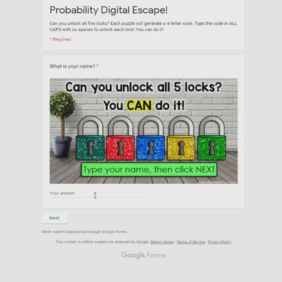 Questions are grouped 4 per puzzle, resulting in five 4-letter codes that will unlock all 5 locks. The entire activity is housed in one GOOGLE Form. There are no links to outside websites. The 4-letter codes are set with answer validation so that students cannot move to the next puzzle until they enter the correct code. Includes answer key.